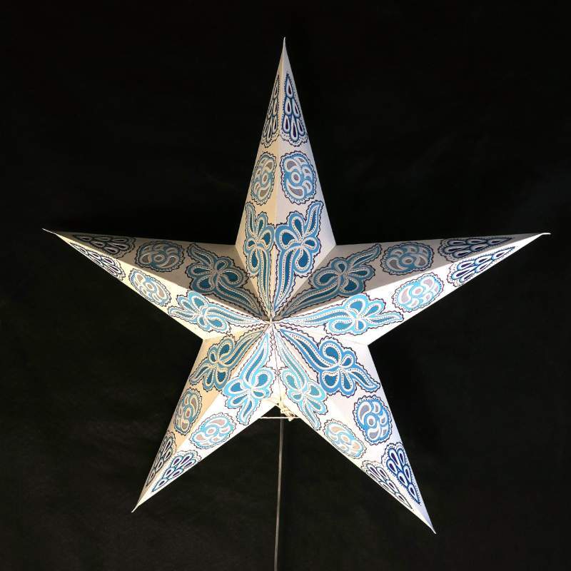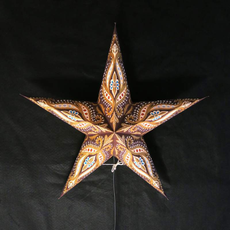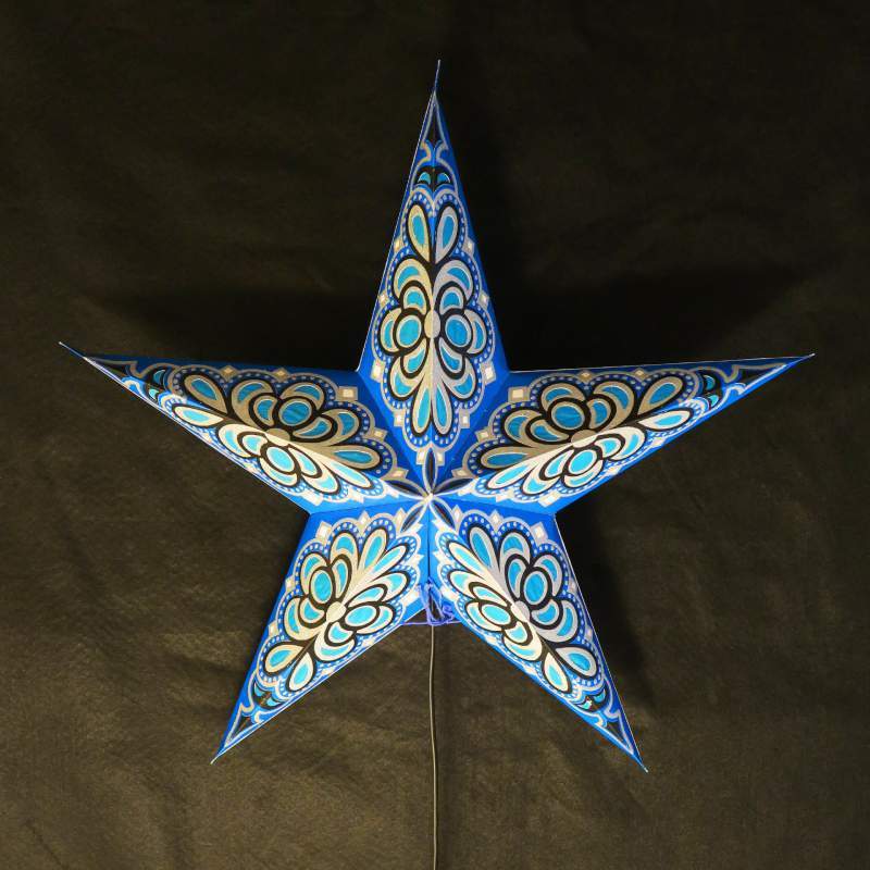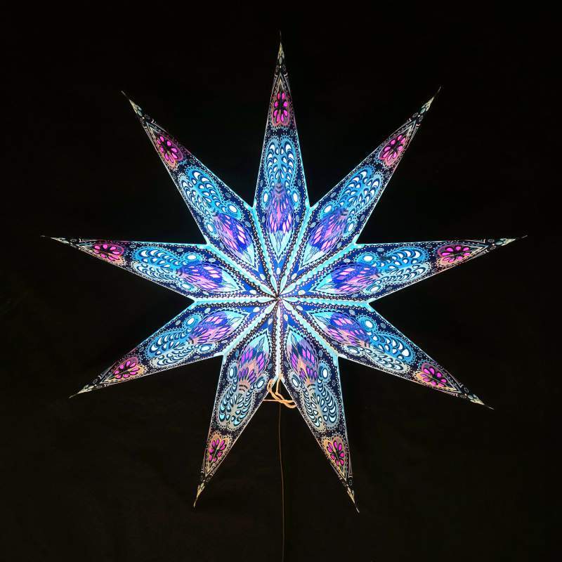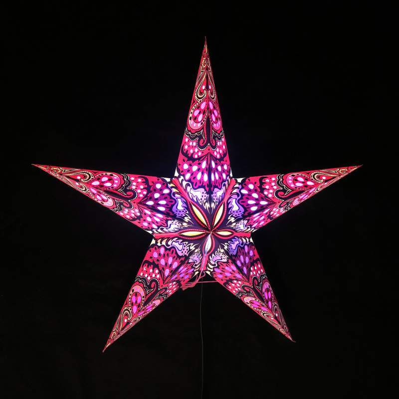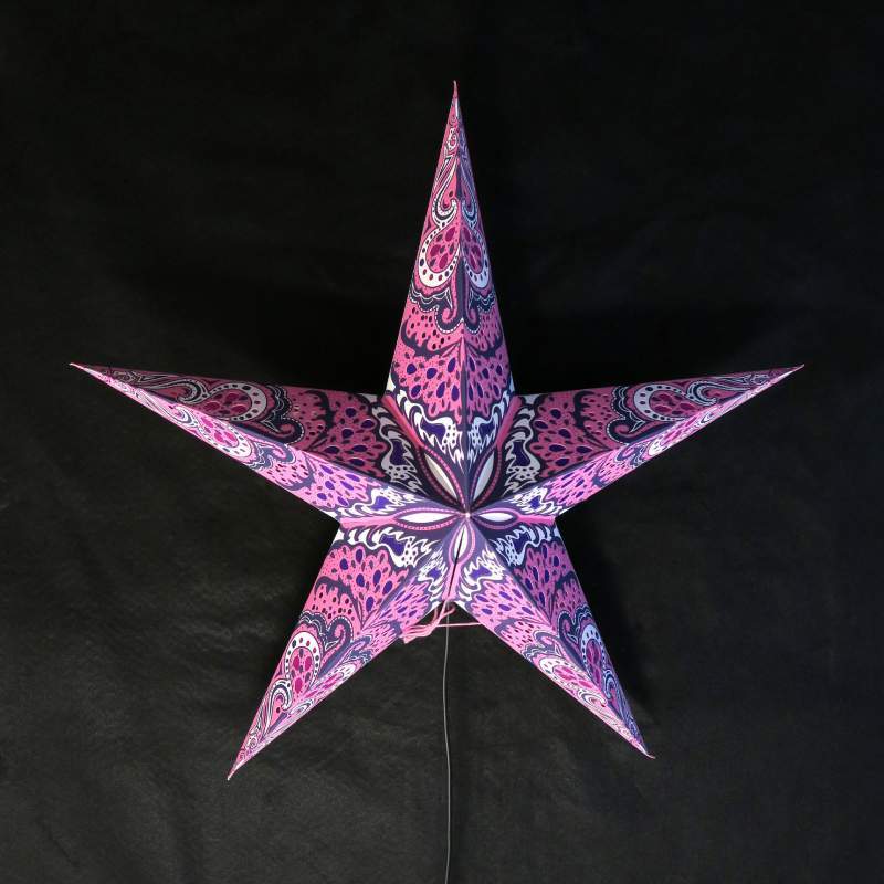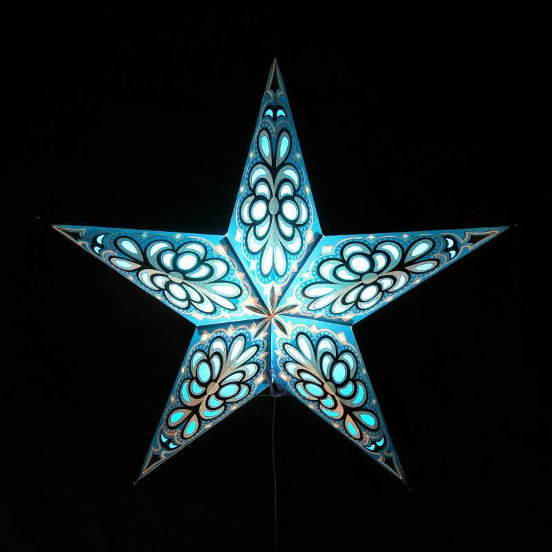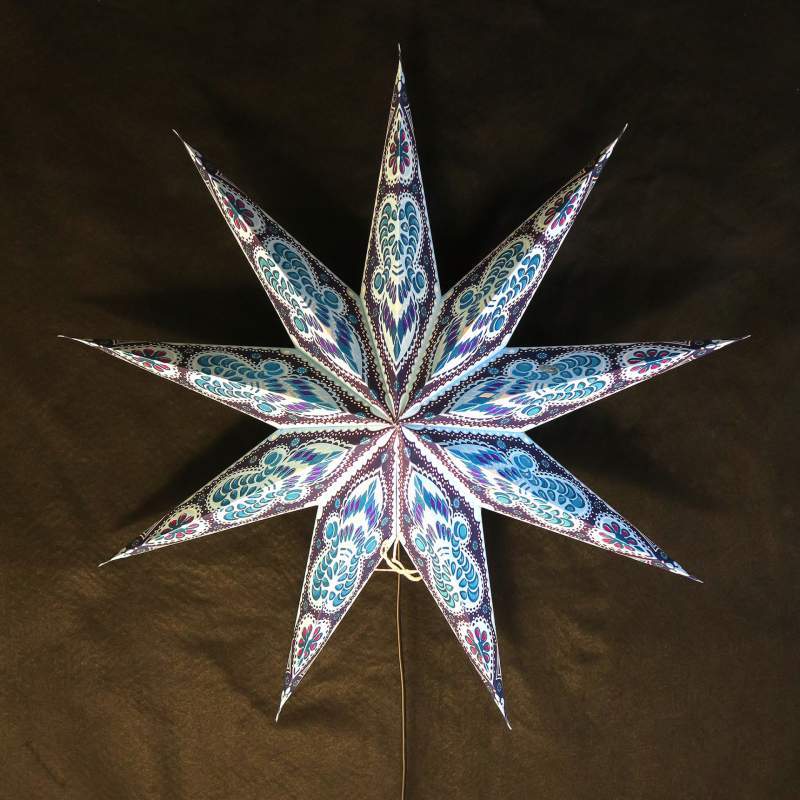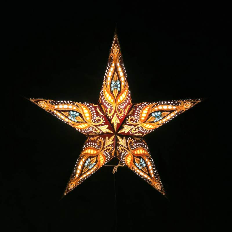 Chaque étoile est sérigraphié a l’aide de colorants traditionnels avant d’être perforé a la main avec une matrice. Les inserts en papier de soie sont collés sur les perforations avant l’assemblage de l’étoile.EFFETS DE LUMIÈRE